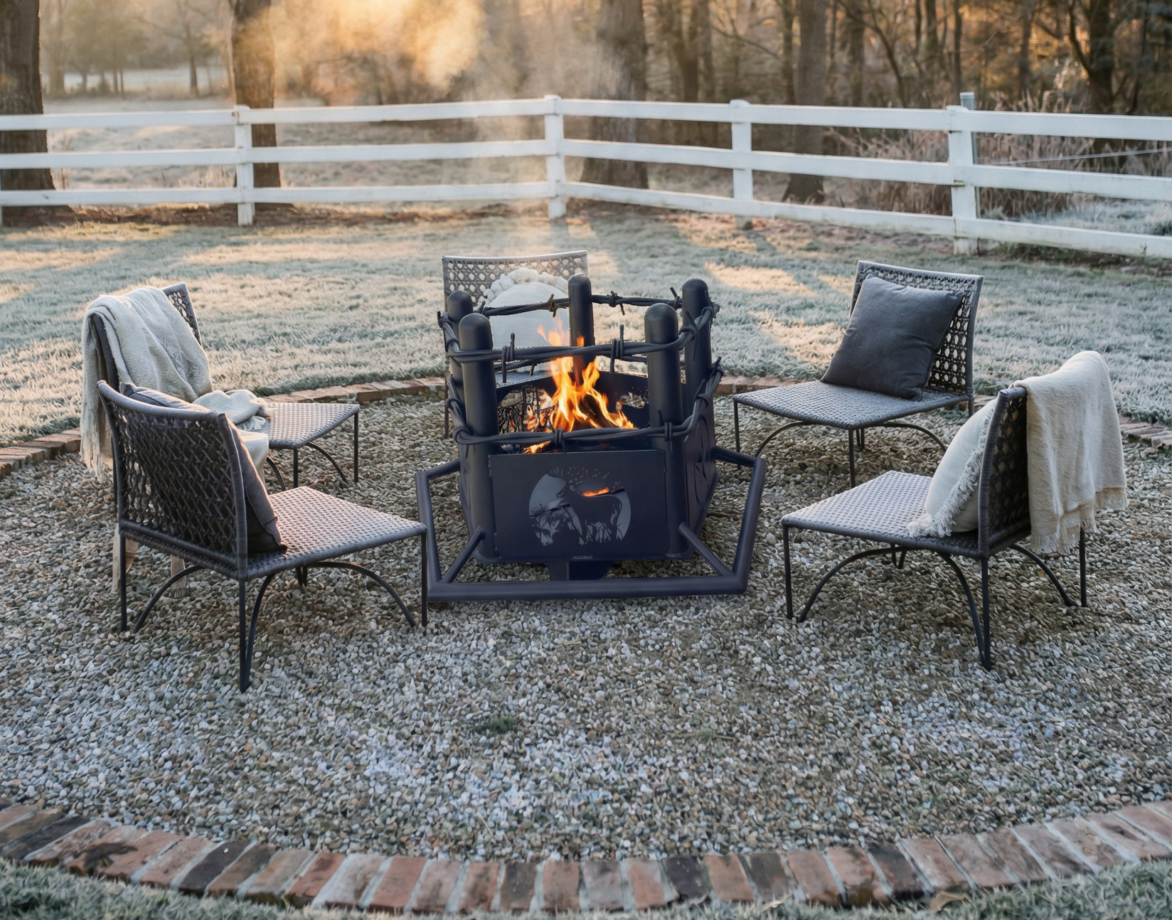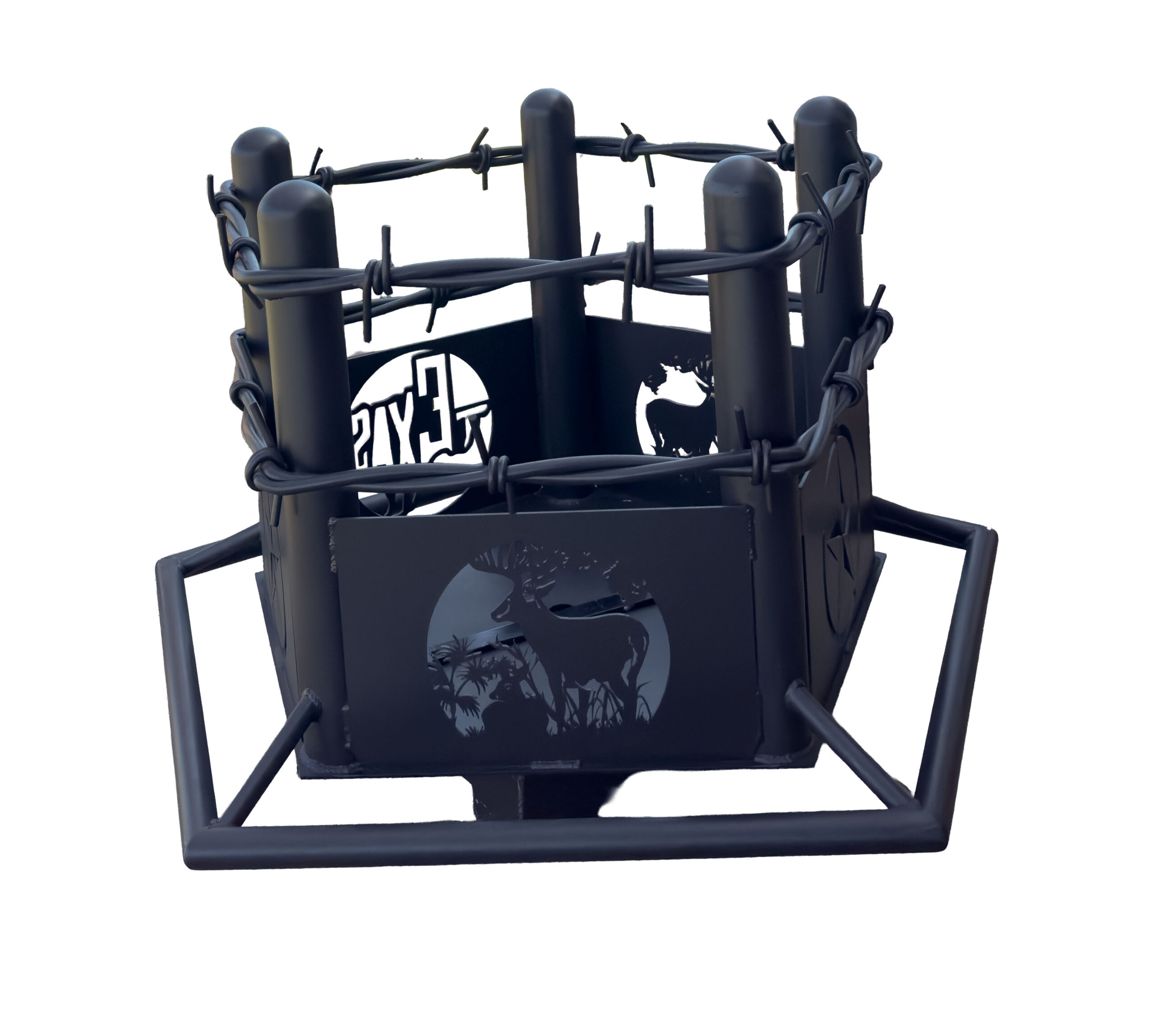 Bring a deer hunter look to your outdoor space with a built to order Texas Deer Hunter themed fire pit made by Trails West Gate Company. We fabricate each fire pit in our shop with clean welds and solid steel so it holds up through real use. The deer hunter cutout design throws a strong flame glow at night and fits right in at a ranch, a hunting camp, or a backyard built for weekends outside.